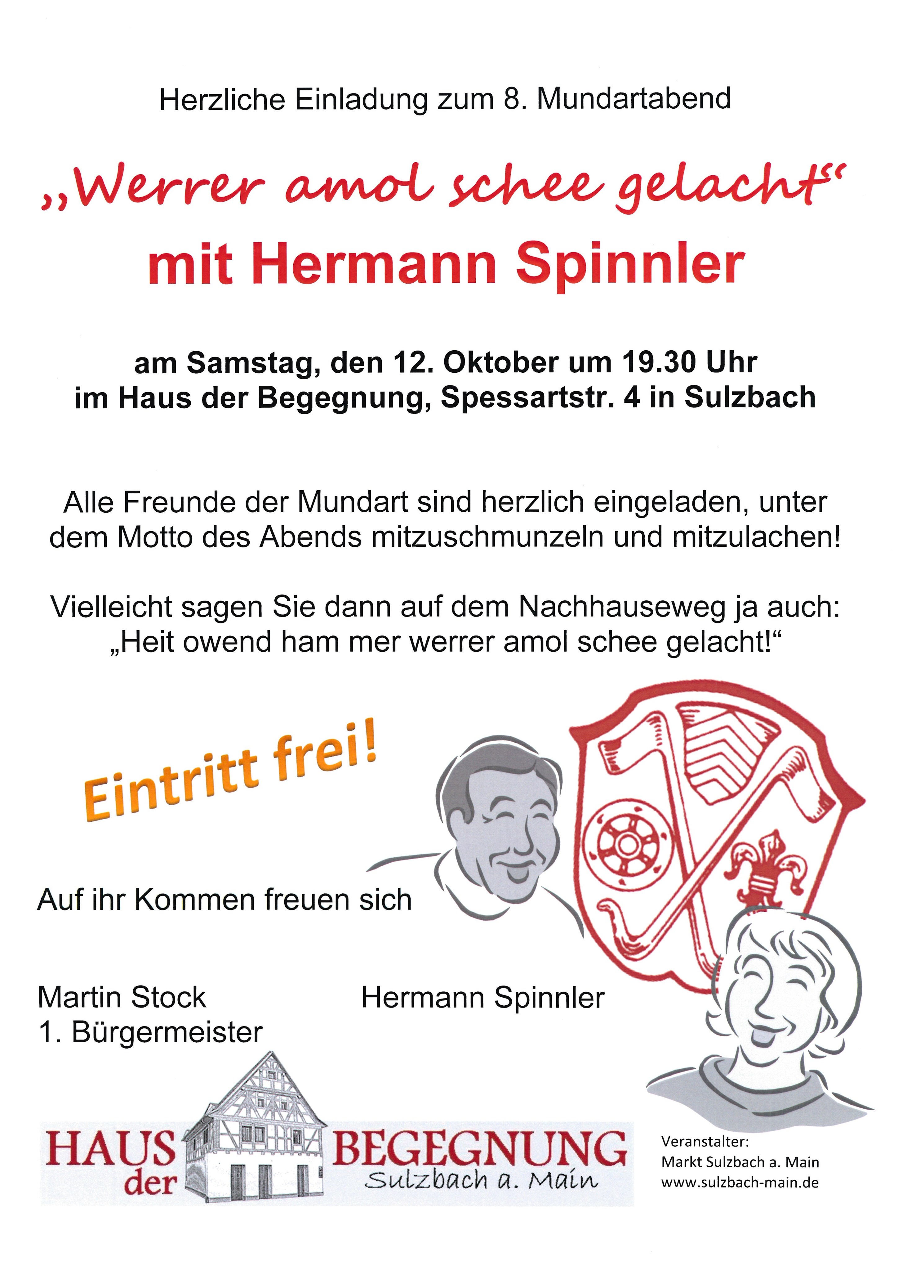 Der 8. Mundartabend von Hermann Spinnler. --- Nach sieben Mundartabenden in den vergangenen Jahren möchte ich meine Zuhörer und Zuhörerinnen auch in diesem Jahr wieder mit neuen Geschichten, Sprüchen, Versen und Liedern unterhalten. Dabei steht natürlich die Sulzbacher Mundart im Mittelpunkt. Es wird aber beileibe nicht nur „Sulzbacherisch gebabbelt“. Lassen Sie sich überraschen. Alle Freunde der Mundart sind herzlich eingeladen unter dem Motto des Abends mitzuschmunzeln und mitzulachen. Vielleicht sagen Sie dann auf dem Nachhauseweg ja auch: „Heit owend ham mer werrer amol schee gelacht“. ------ Der Eintritt ist frei!