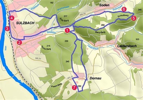 Start und Ziel der permanent ausgeschilderten Mountainbike-Strecke ist der Festplatz in Sulzbach. Auf rund 29 Kilometern erwartet Sie ein abwechslungsreicher Rundkurs mit Erdwegen, Singletrails, Schotterpassagen und teils knackigen Anstiegen mit bis zu 25 % Steigung.